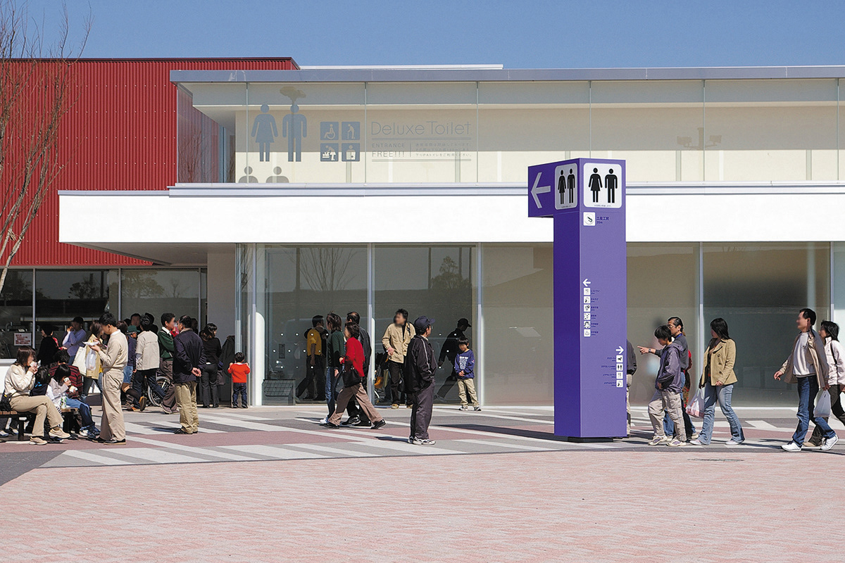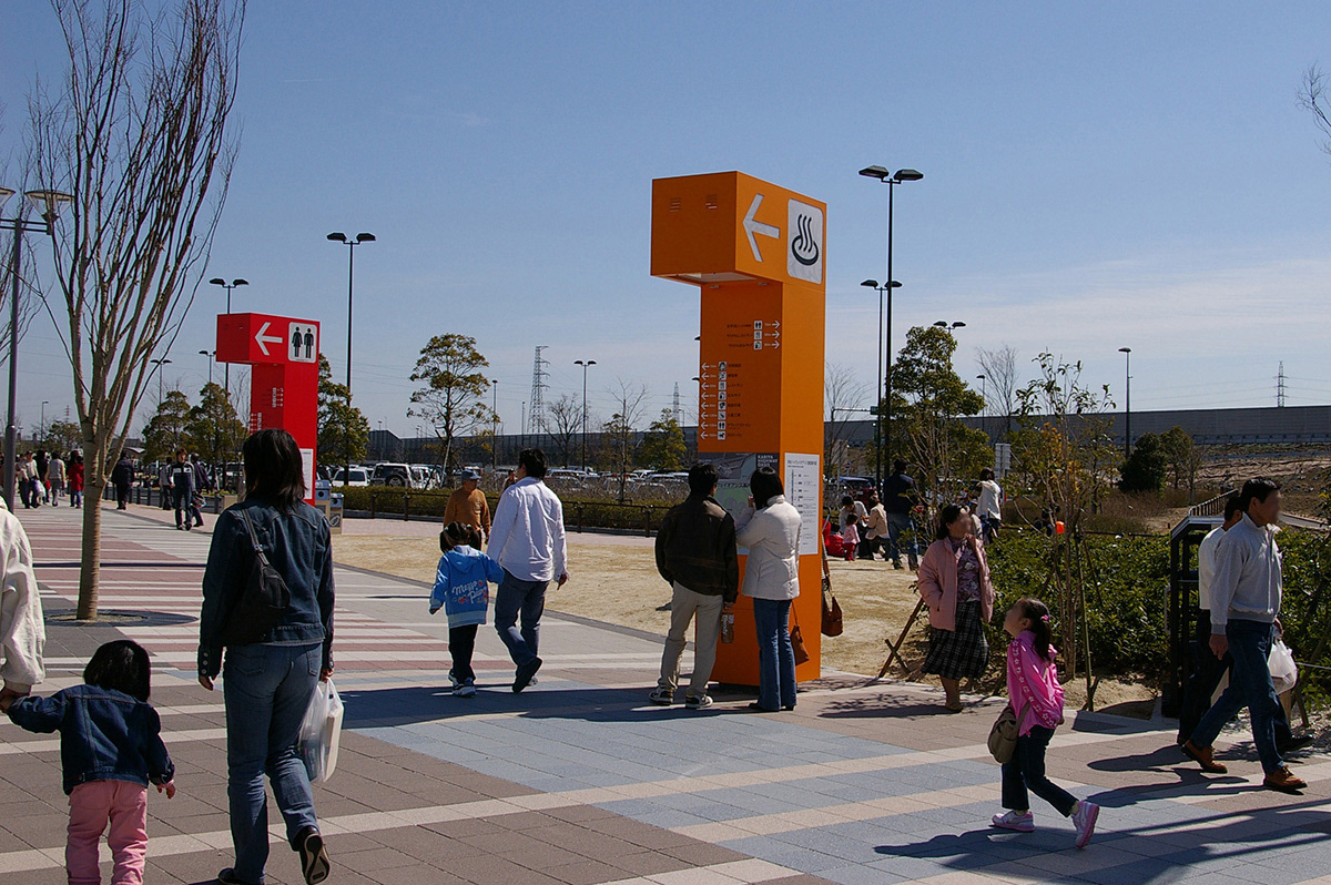 愛知県刈谷市の伊勢湾岸自動車道に新設されたパーキングエリア。上下線PAを含め全体を一本のプロムナードで結び、「街」に見立て、50mおきに逆L字型のサインを置くことで散歩を促した。逆L字型サインには遠景から近景まで、それぞれの距離・シーンに応じた情報を発信している。