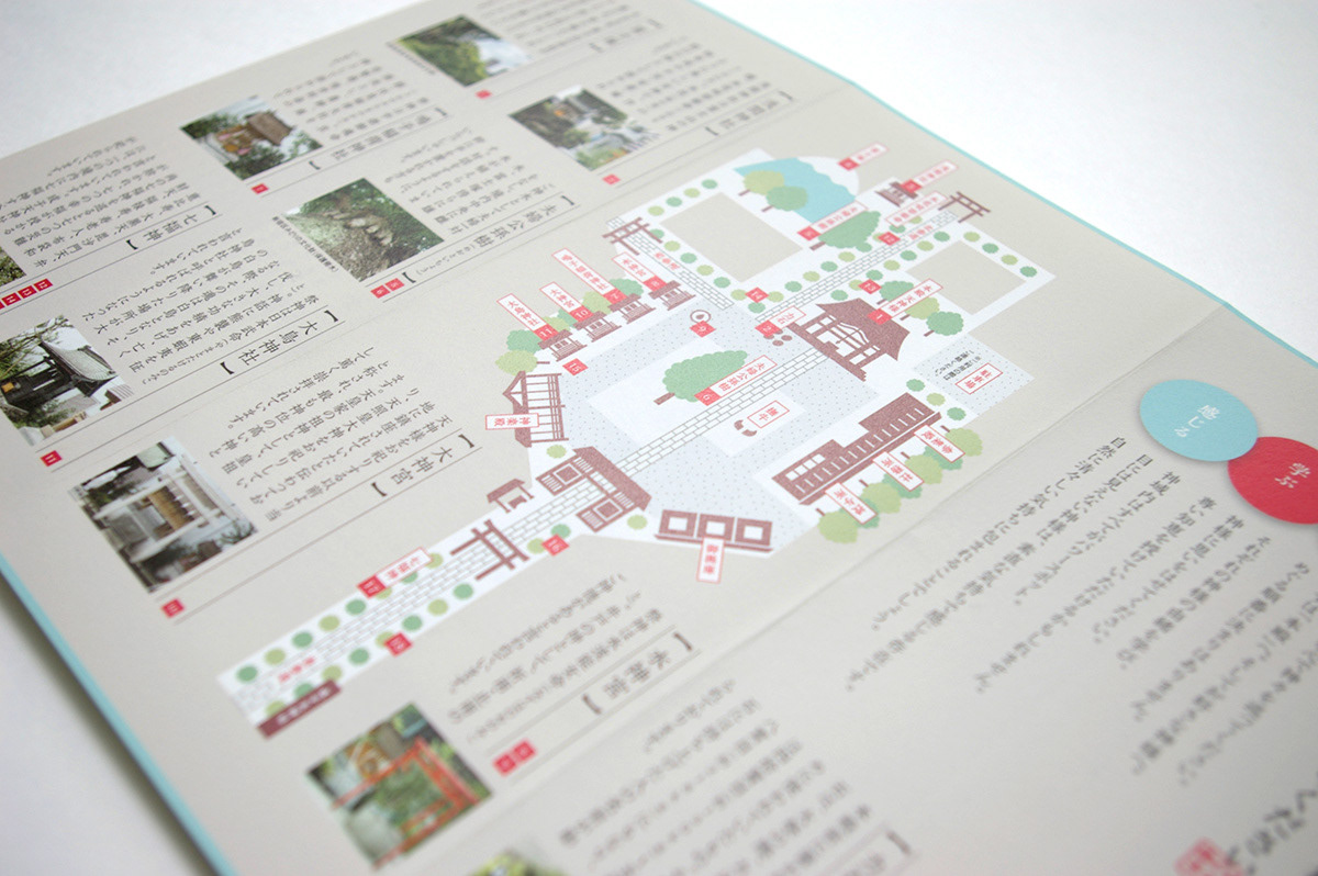 高層ビルに囲まれた西新宿にある、千年を超える歴史を持つお社。境内には天神様だけでなく様々な神様が祀られているほか、富士塚・七福神・力石・撫牛(なでうし)など数多くの見所があり、それらを「めぐり天神」と名付けて境内を整備した。テーマカラーとして、まっさらな心で神々を“巡る”を「生成色」、“学ぶ”を天神様ゆかりの「梅紅色」、見えない力を“感じる”を富士の空を表す「淡青色」を掲げた。さらに様々な見所をアイコン化しグラフィックパターンとして、リーフレット・名刺・封筒・webなどに展開することで、たくさんの神様がいる「めぐり天神」であることをわかりやすく発信している。