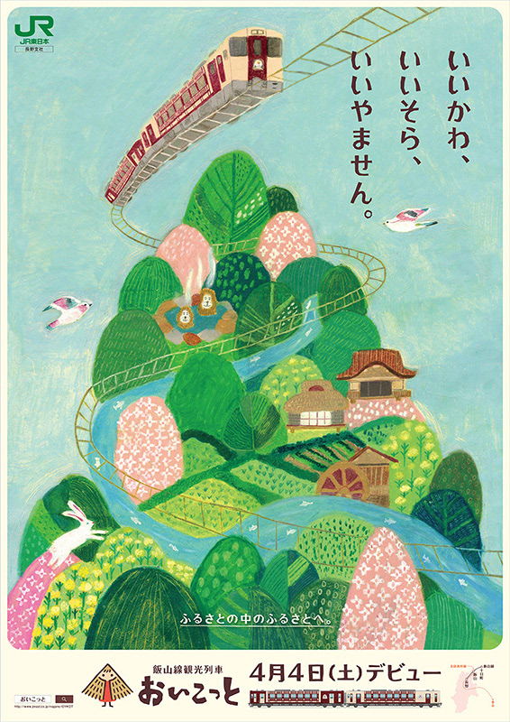JR飯山線「おいこっと」「ふるさと」をテーマにした信州の山間を走る観光列車。車窓からの景色はまさに「日本昔ばなし」の世界、いわゆる日本の原風景が広がっている。沿線には唱歌「ふるさと」の作詞者である高野辰之の生誕地もあるため、この歌をデザインのモチーフとした。「TOKYO」を逆さに読んだ列車名称「おいこっと(OYKOT)」は、都会と反対にのんびり流れる時間を表している。後日、この告知ポスターを見かけた西海岸出身のアメリカ人(奥様が飯山出身)と知り合いになり、現在では東京のオフィスをシェアしている。